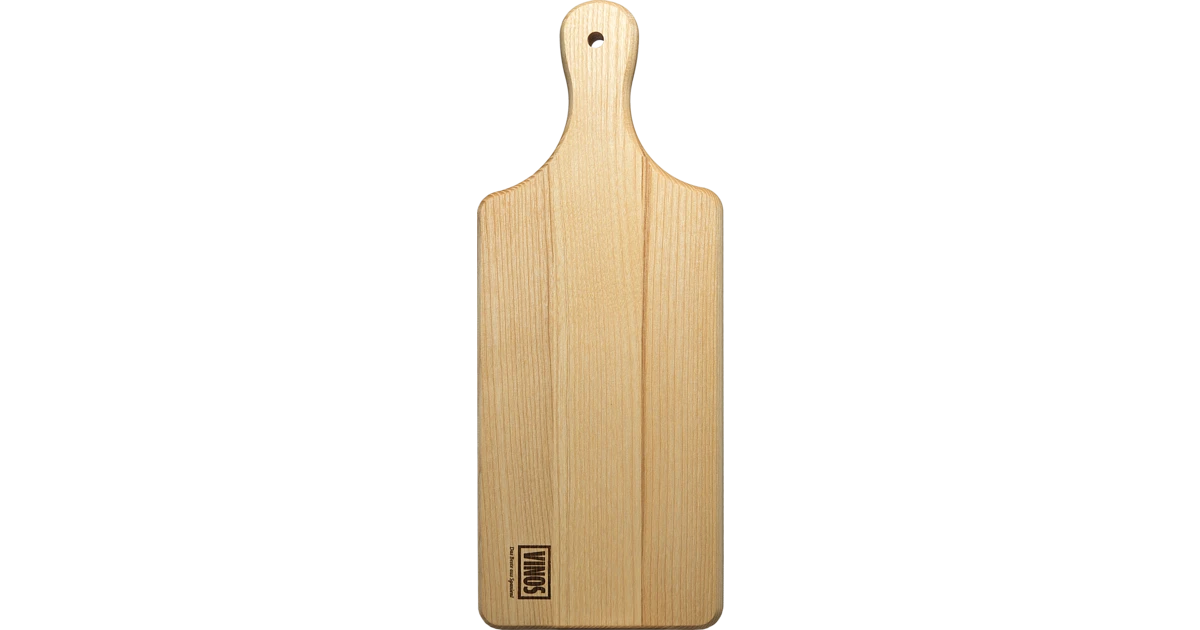 Schönes und hochwertiges Holzbrett für Tapas, Käse oder Serranoschinken aus Eschenholz. Mit Griff und eingebranntem Vinos-Logo auf der Vorderseite. Damit können Sie Ihre Köstlichkeiten einladend präsentieren. Und es ist praktisch dazu.